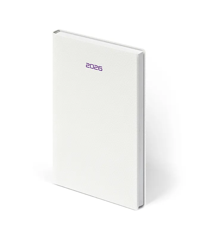 Biały materiał płócienny, z drobną strukturą, recyclingowy. Idealnie nadający się pod nadruk cyfrowy. Oprawa ma delikatną fakturę przypominającą drobniutkie tkane oczka.