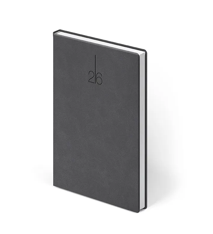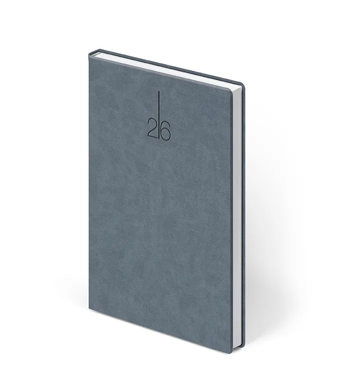 Oprawa swoją fakturą przypomina zamsz. Matowa, elegancka okładka bardzo ładnie, głęboko się tłoczy. Występuję w stonowanych, biznesowych kolorach.