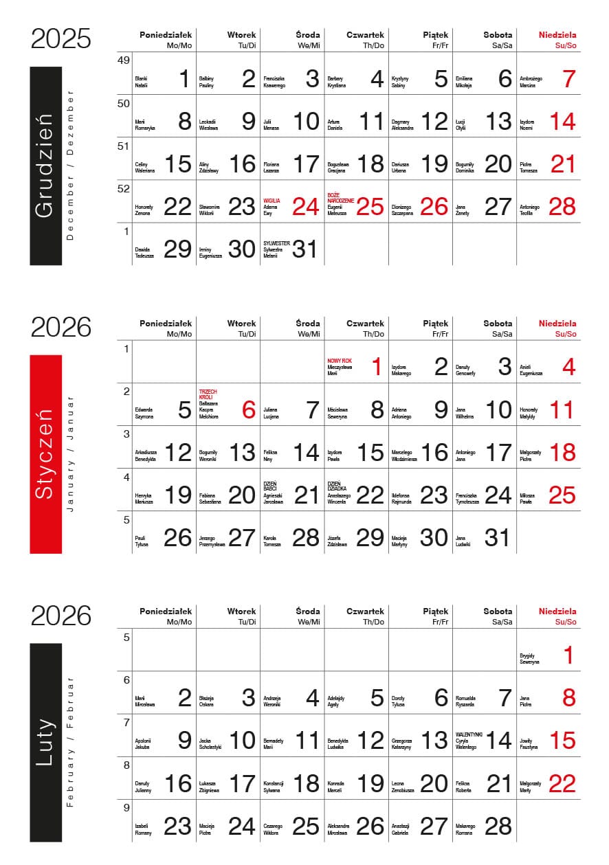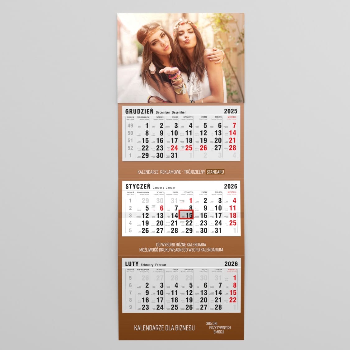 Klasyczny trójdzielny kalendarz ścienny, z możliwością zaprojektowania własnego tła (pleców) oraz główki. Solidne wykonanie idzie w parze z wysoką funkcjonalnością. Model najbardziej popularny wykorzystywany w biurach. Wizerunek i reklama firmy przez cały rok.