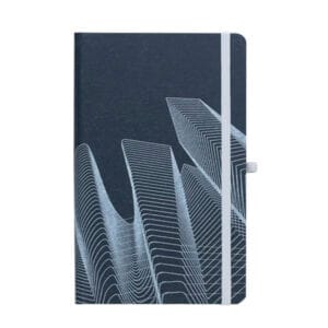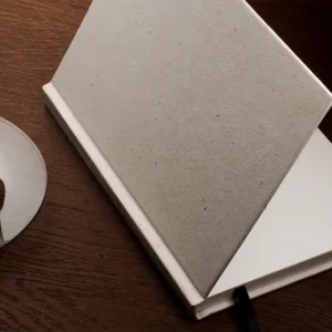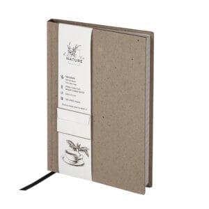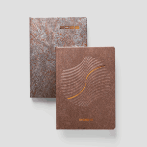 Papierowa oprawa o strukturalnej fakturze. Powlekany papier, w ponad 50% z recyklingu, o unikalnym efekcie…