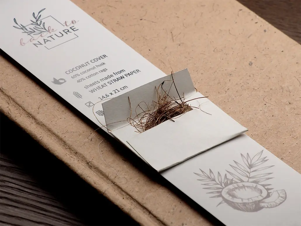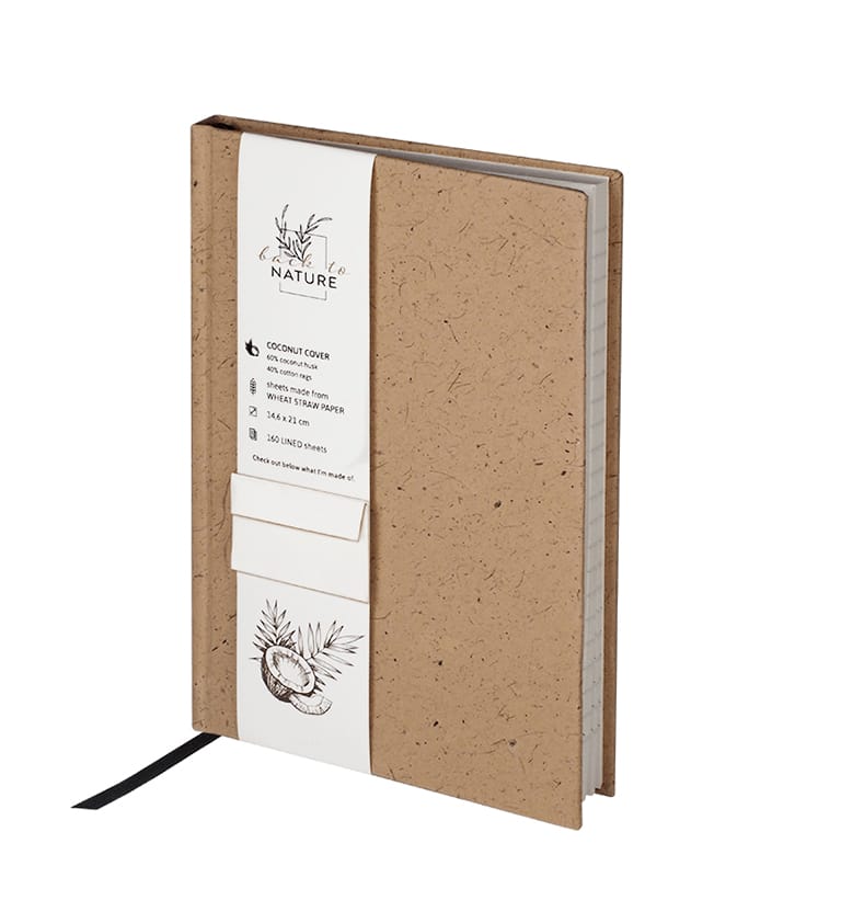 Oprawa wykonana z 60% włókna łupiny kokosa oraz 40% odpadów bawełnianych. Jedna tona łupin orzecha kokosowego pozwala oszczędzić 12 drzew, które byłyby potrzebne do wyprodukowania takiej samej ilości papieru drzewnego.