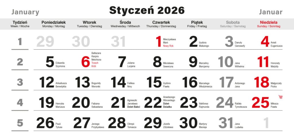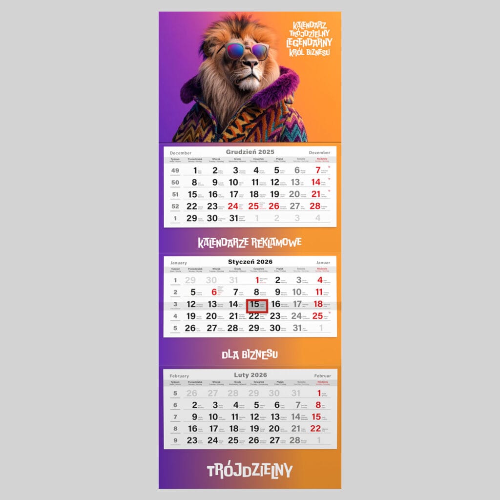 Ekonomiczny trójdzielny kalendarz ścienny, z możliwością zaprojektowania własnego tła (pleców) oraz główki. Solidne wykonanie idzie w parze z wysoką funkcjonalnością. Model najbardziej popularny wykorzystywany w biurach. Wizerunek i reklama firmy przez cały rok.