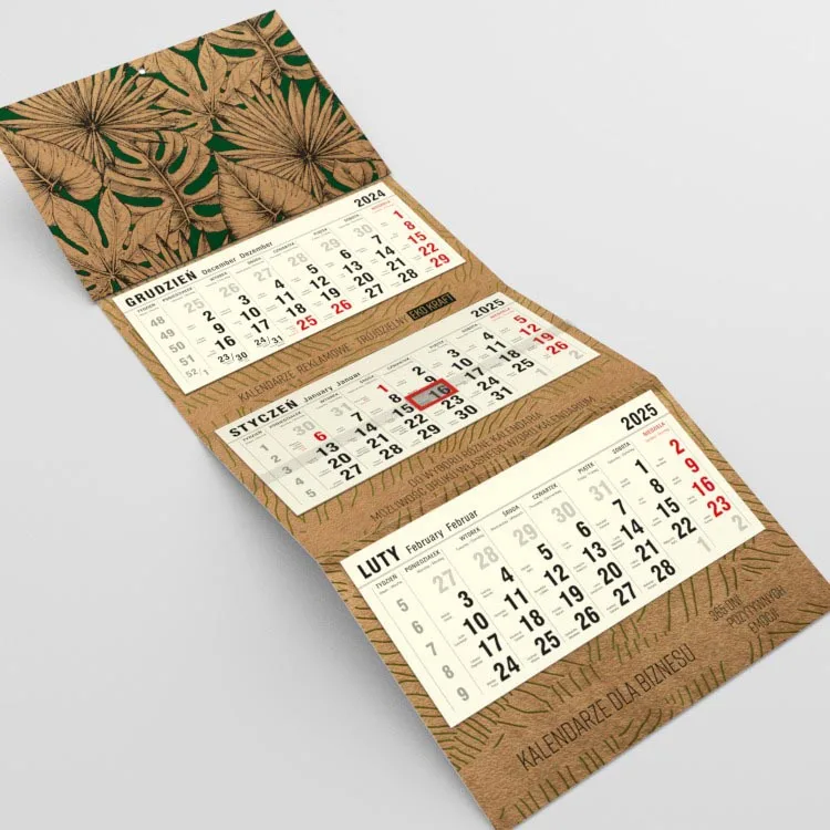 Ekologiczny kalendarz trójdzielny, wykonany z bezpiecznych dla środowiska materiałów. Przeznaczony do wieszania na ścianie lub meblach.