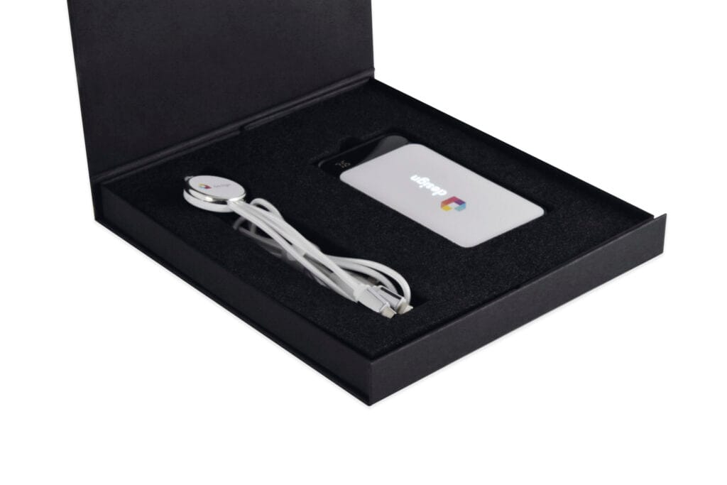 Zestaw upominkowy zawiera powerbank oraz długi rozgałęźnik USB.